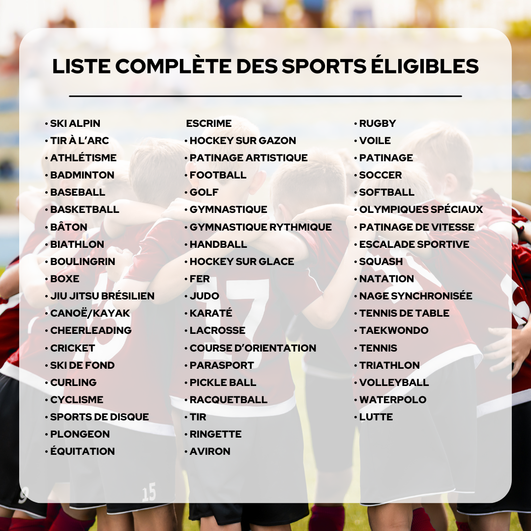 Pour consulter la liste complète des sports éligibles, veuillez cliquer ici.